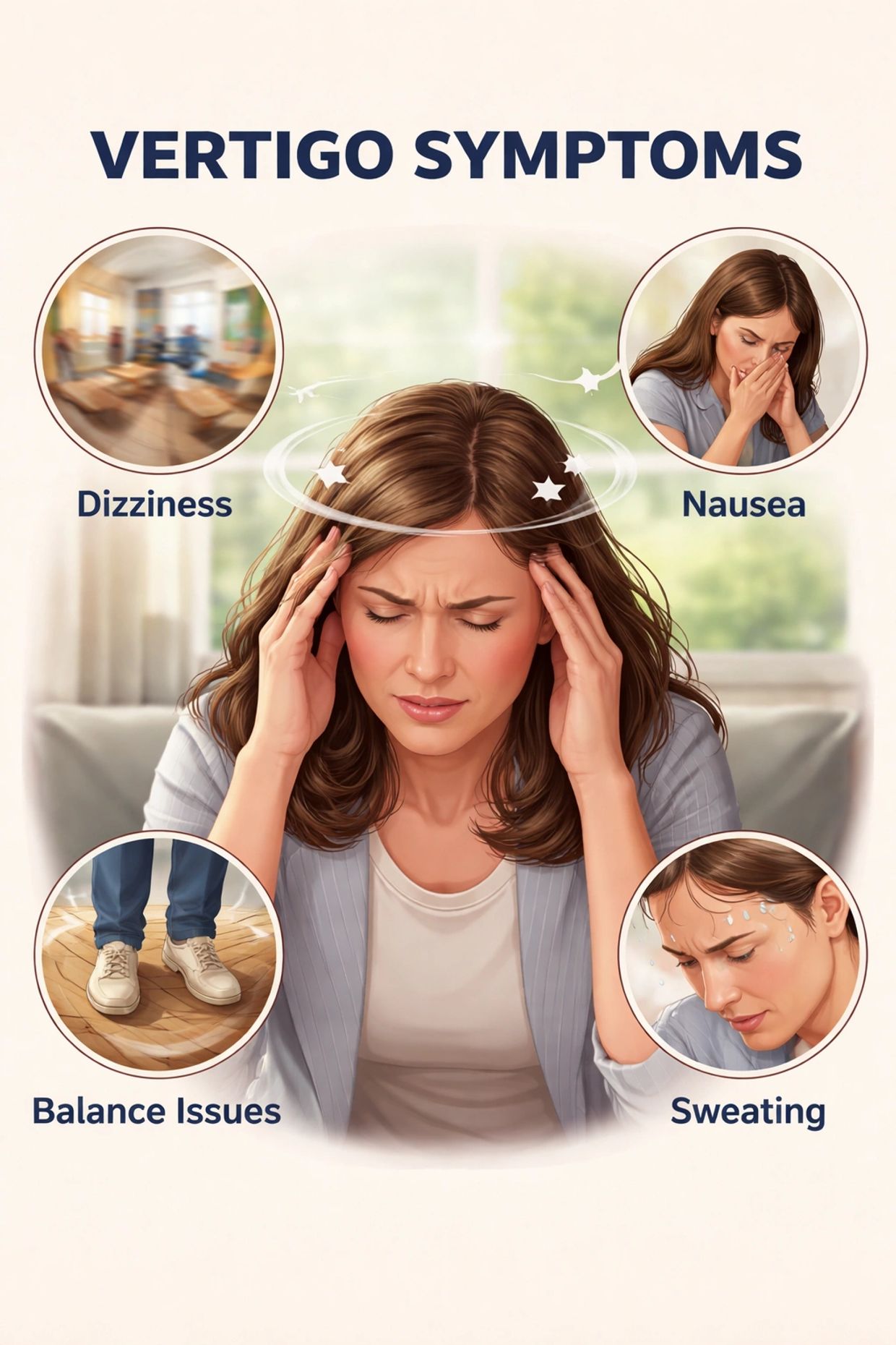 Vertigo is a sensation that you or your surroundings are spinning or moving, even when you are still. It is often caused by disturbances in the inner ear balance system, which helps your body understand position and movement. Vertigo can feel sudden and intense and may be accompanied by dizziness, nausea, imbalance, or difficulty focusing your vision.